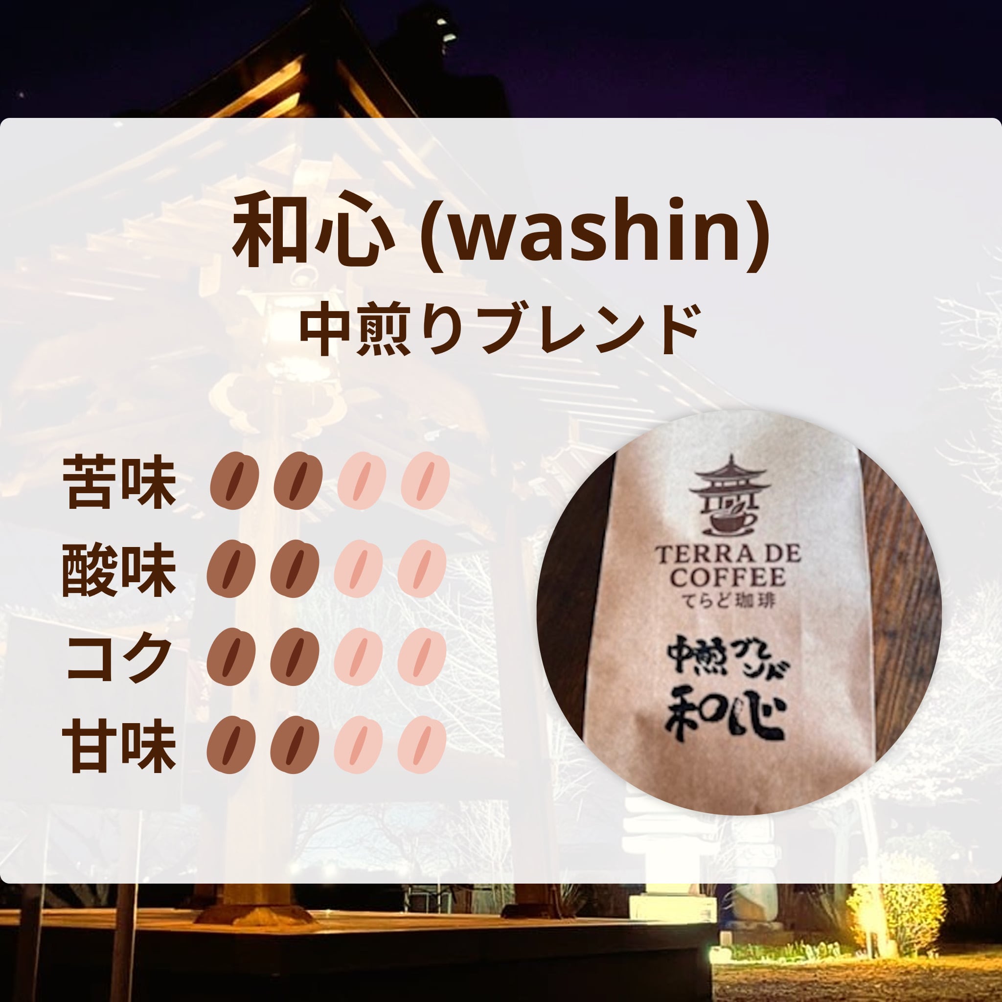 心を癒す、和の風情。和心は、バランスの取れた酸味と深いコクが特徴の中煎りブレンドで、心温まるひとときを提供します。注文を受けてから焙煎されるため、いつでも新鮮な味わいをお楽しみいただけます。
